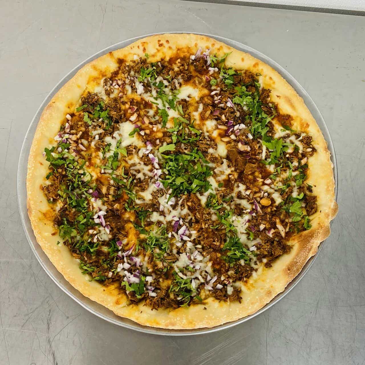 Beef, tomato, red onion, ranch dressing, Cheddar cheese and parmesan.
